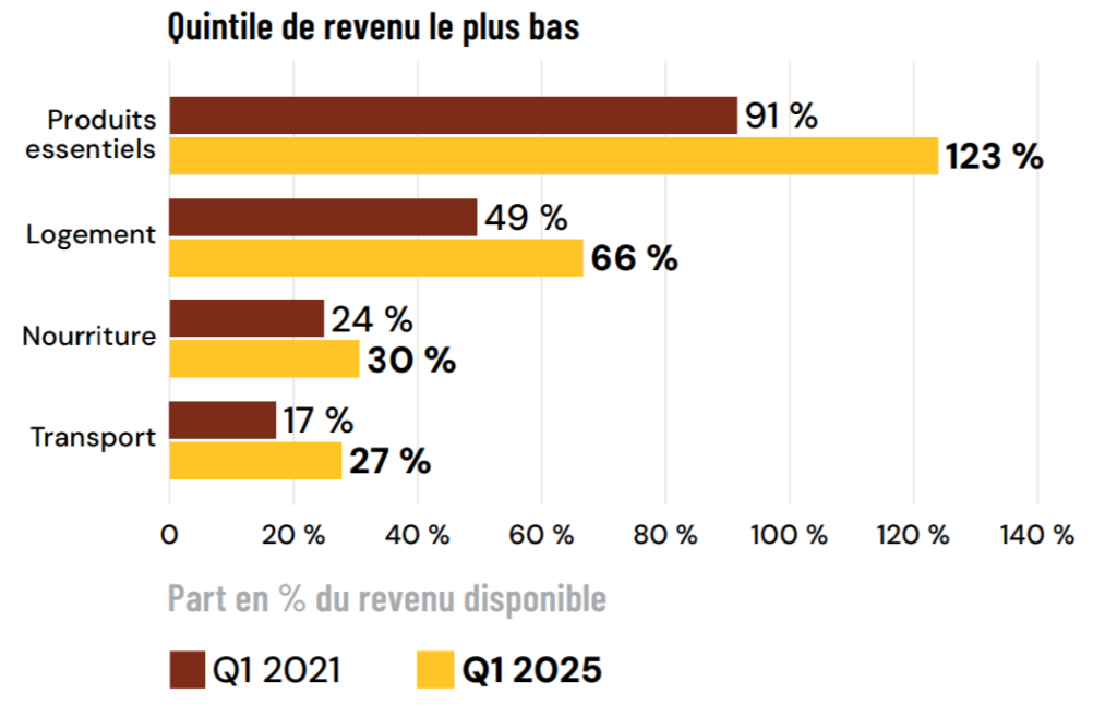 Le graphique ci-dessous illustre la réalité du quintile de revenu le plus bas du Canada (le cinquième des gens ayant le revenu le moins élevé au pays) : un groupe comptant plus de 8 millions de personnes. En 2021, ce groupe utilisait près de la moitié de ses revenus uniquement pour se loger, en moyenne, ce qui était déjà un fardeau. Aujourd’hui, le logement représente deux tiers de leur revenu, ce qui ne laisse qu’un tiers pour tout le reste, y compris la nourriture.