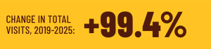 The proportion of children under 18 accessing food banks continues to hold at 33% of food bank clients; however, given the growth of food bank usage since the pre-pandemic period, that 33% now represents nearly 712,000 visits — an increase of over 340,000 monthly visits compared to six years ago. In addition, there has been a significant increase in the proportion of two-parent households with children under 18 accessing food banks — from 18.8% in 2019 to 23% in 2025
