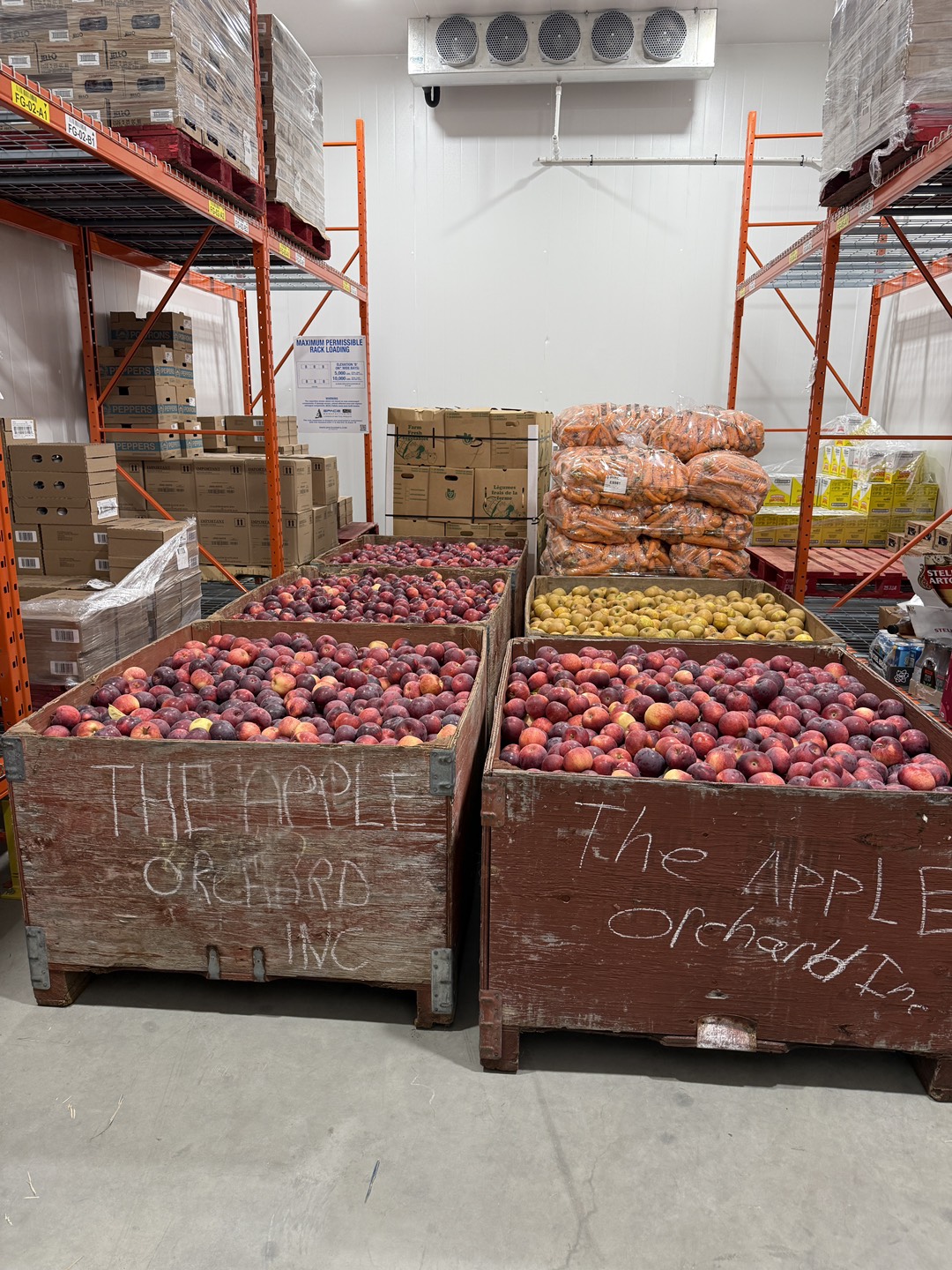 <Photo caption: Apples from The Apple Orchard on the warehouse floor at Feed Halton, a southern Ontario food bank.>